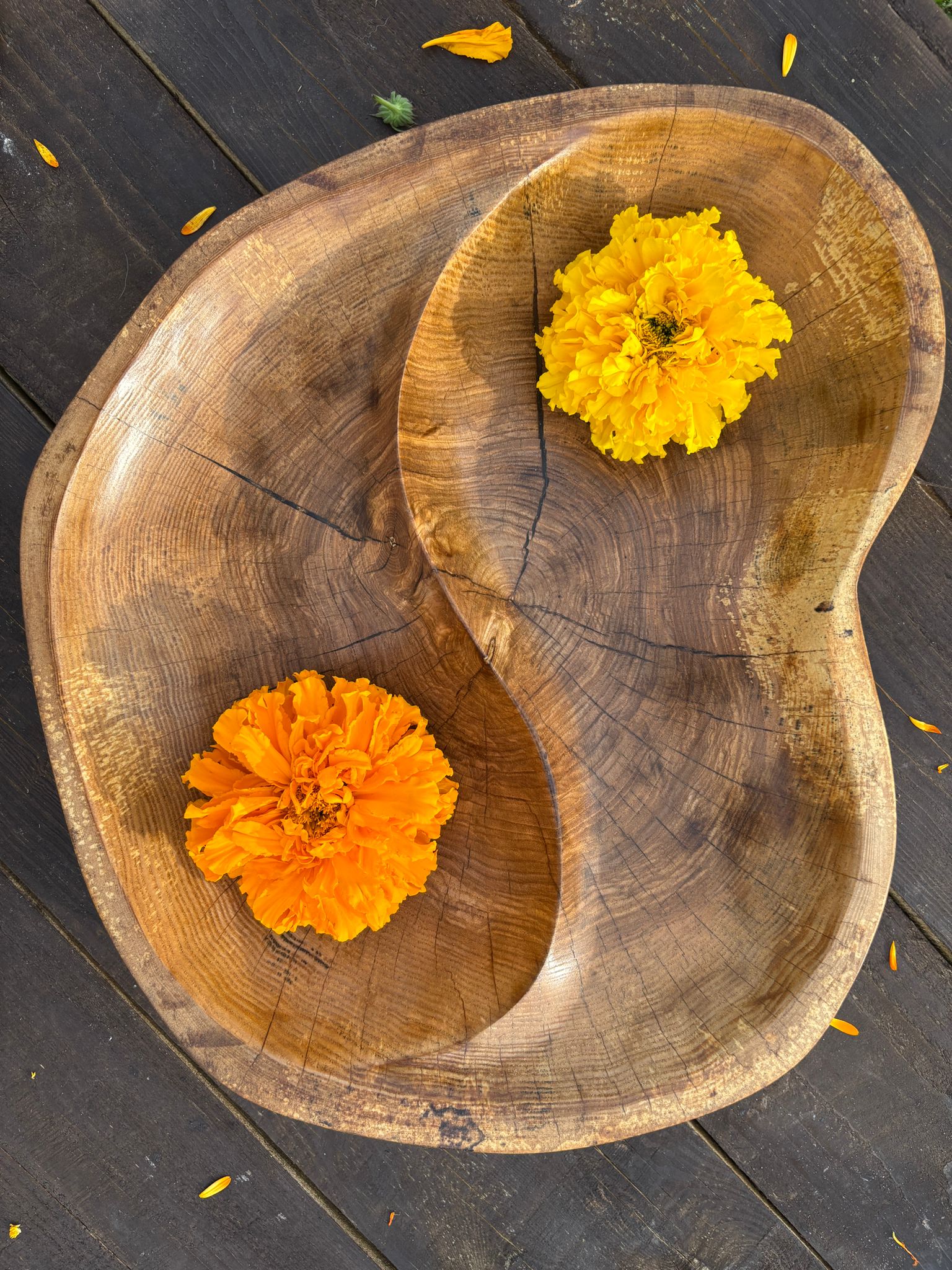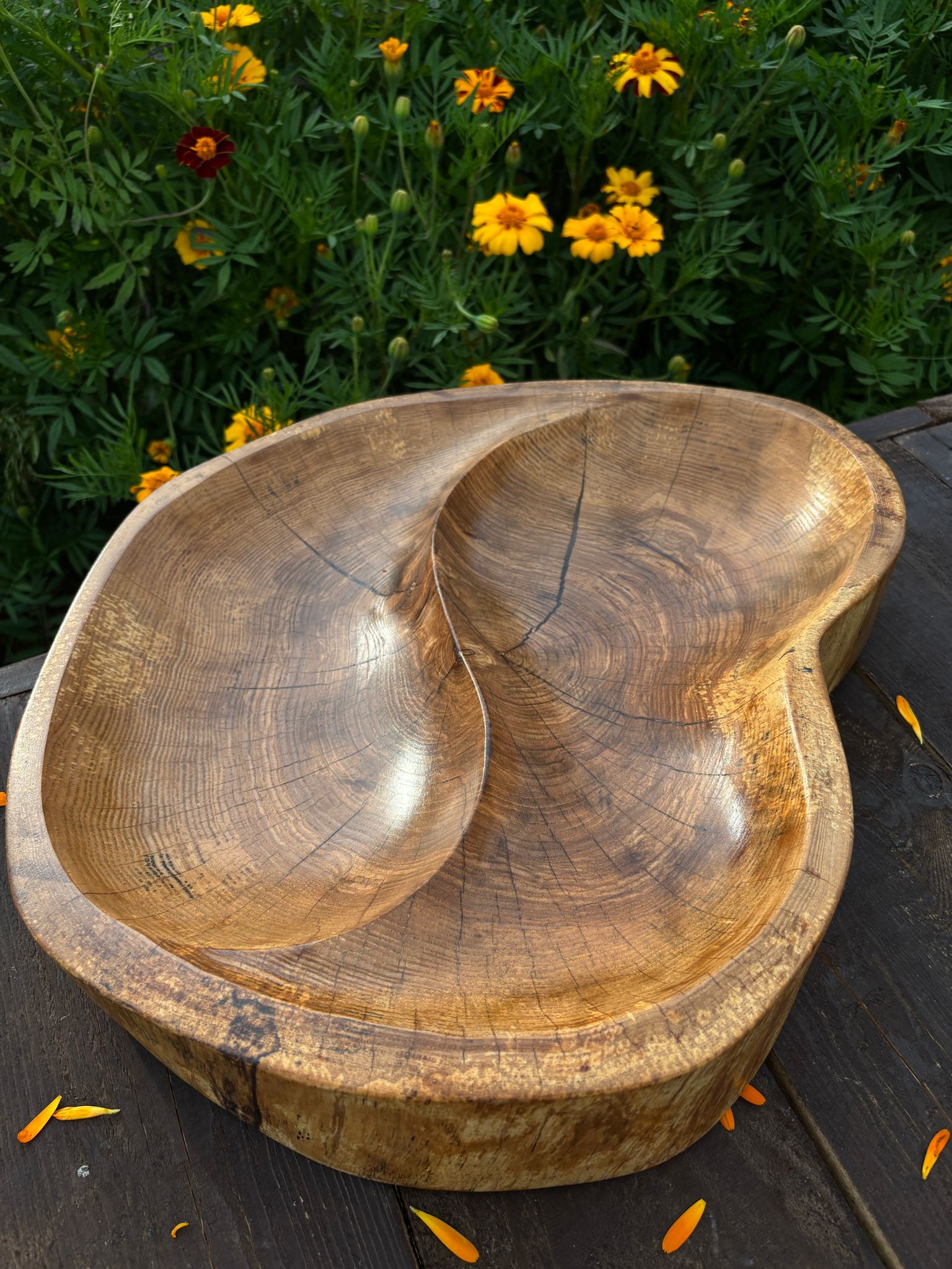 Tā forma ir vienkārša, bet jēga - dziļa: divi iedobumi, kas it kā atspoguļo viens otru, simbolizējot tuvumu un līdzsvaru, kas rodas, kad “es” sastop “tu”. Amatnieka rokās šis koks atdzimis kā veidojums, kur kustība satiekas ar mieru - kā viļņa elpa, kas pieskaras krastam.