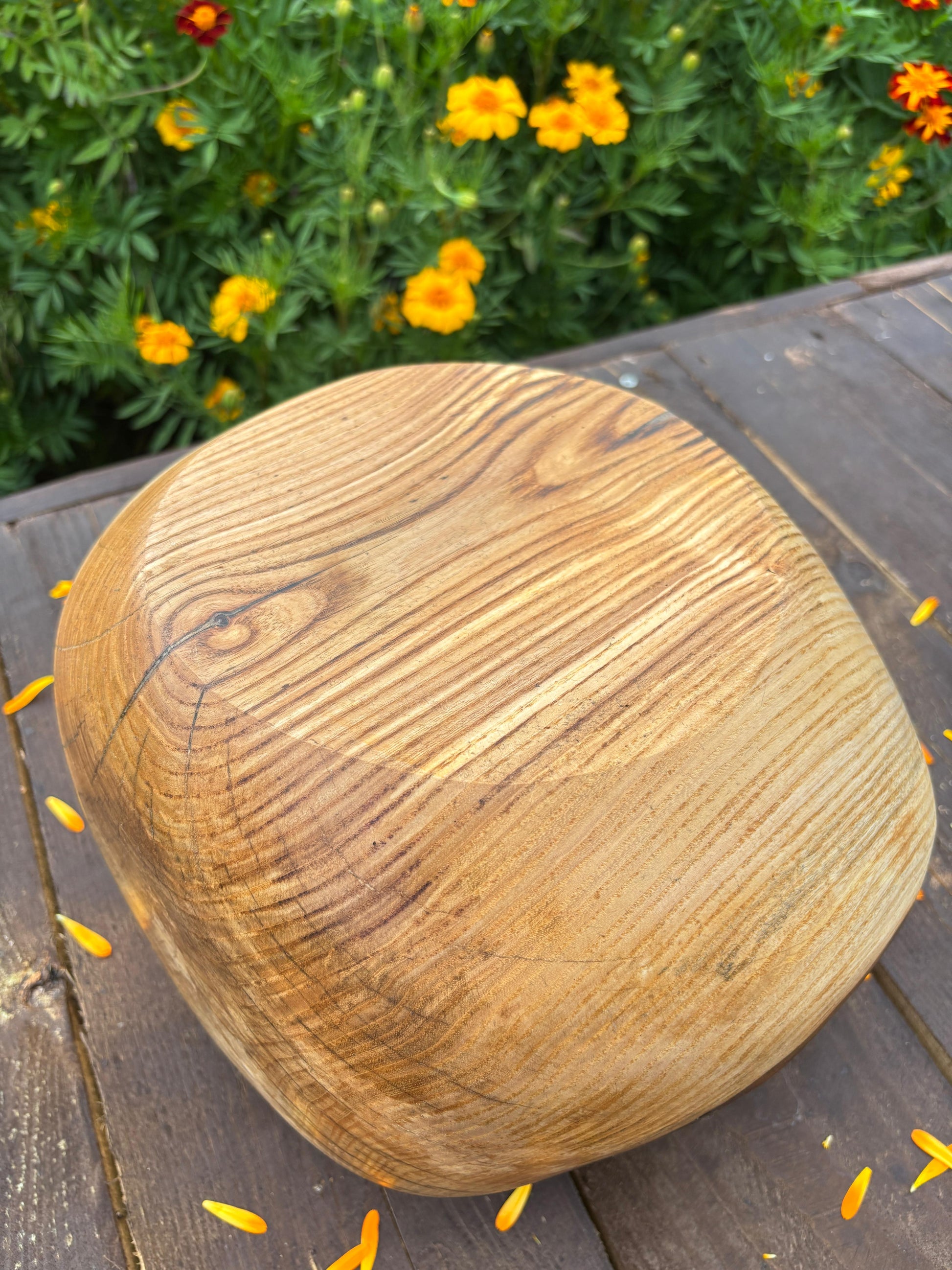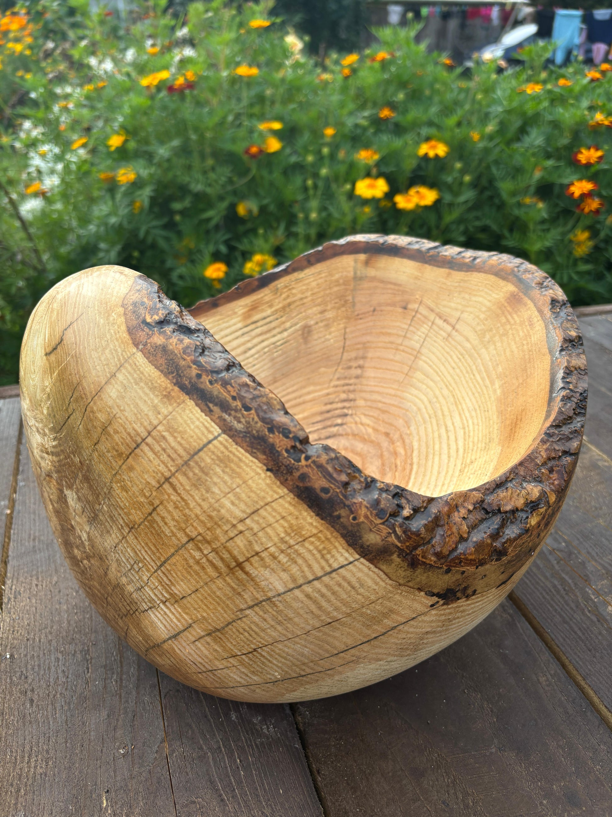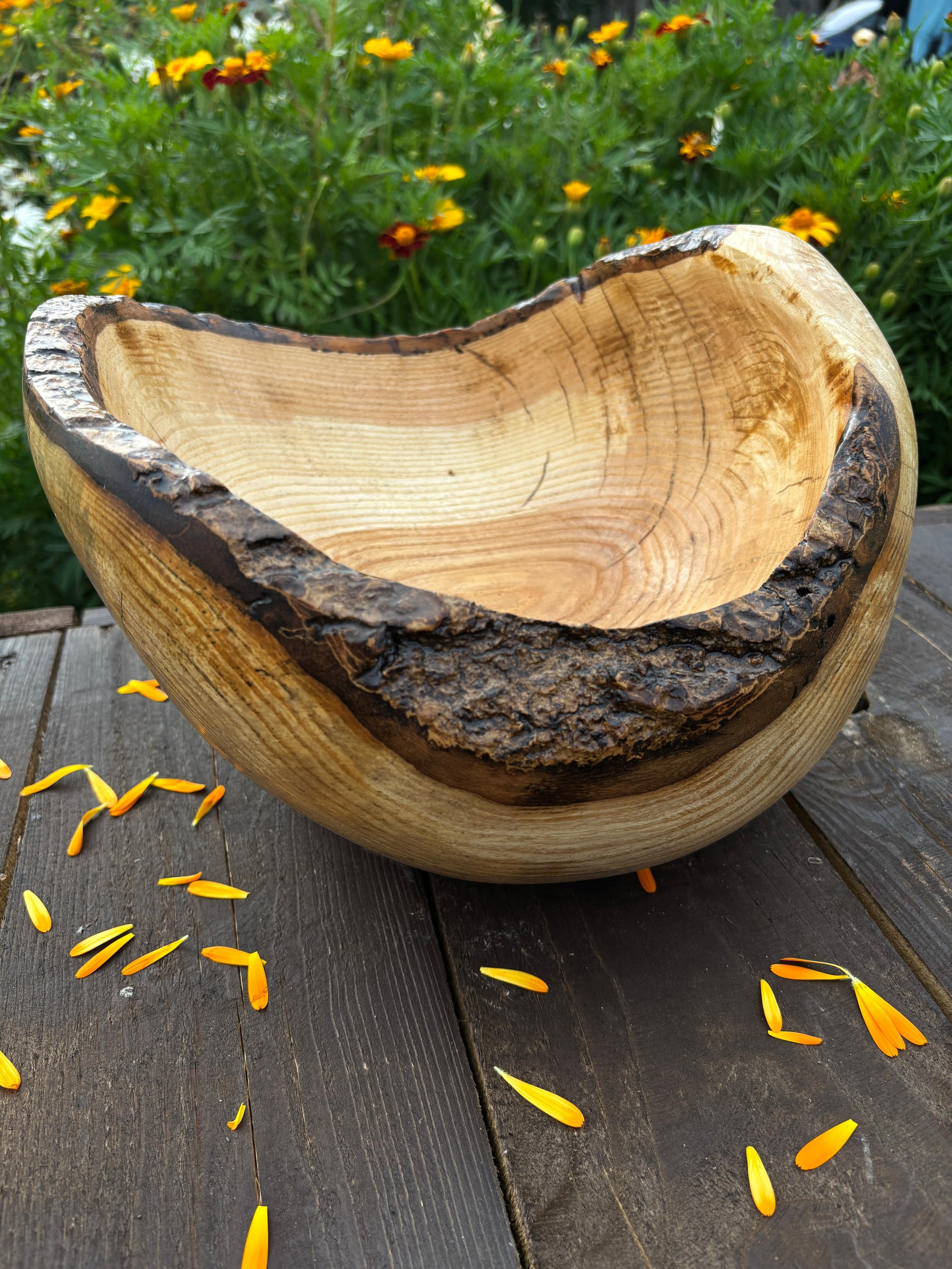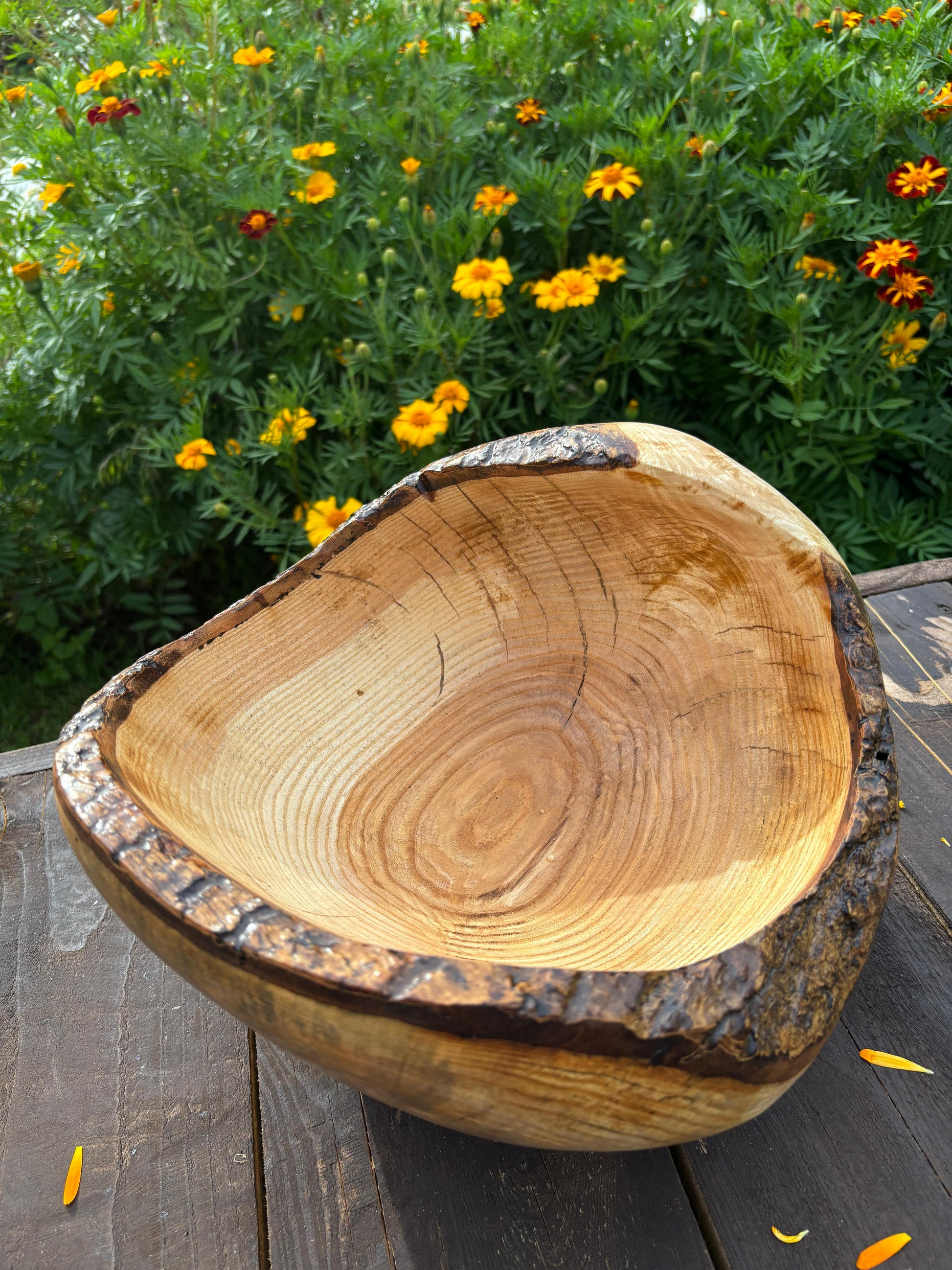 Izgrebts kā noapaļota sfēra ar plašu atvērumu, tas apvieno mākslu un funkcionalitāti pilnīgā līdzsvarā. Gludās, plūstošās koka šķiedras mijas ar dabīgo mizas līniju, kas caur dzidro epoksīdu saglabāta laikā - kā atgādinājums par koka sākotni, par spēku un izaugsmi. Mizas maliņa kā dzīves pēdas, gredzeni kā laika ritms, siltā krāsa kā dabas sirds, kas mājās ienes mieru un siltumu.
